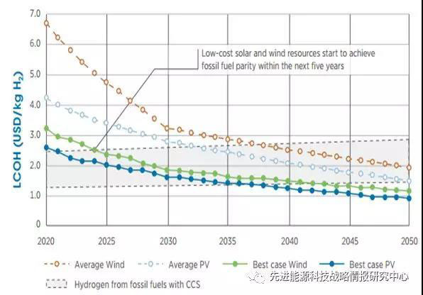 圖3 風(fēng)電和光伏發(fā)電制氫成本發(fā)展趨勢(shì)(單位:美元/kg)