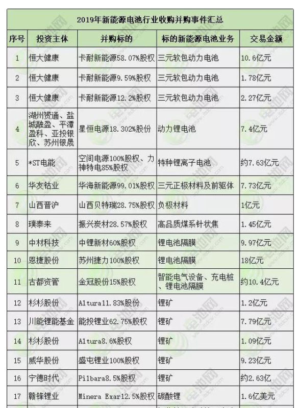 據(jù)電池網(wǎng)不完全統(tǒng)計(jì),2017年新能源電池行業(yè)最終宣告失敗的案例有10起左右,2018年也超過14起,2019年僅6起:大洋電機(jī)終止收購(gòu)上海重塑部分股權(quán)、科恒股份終止收購(gòu)譽(yù)辰自動(dòng)化100%股權(quán)和誠(chéng)捷智能100%股權(quán)、華友鈷業(yè)放棄并購(gòu)巴莫科技、愛康科技終止收購(gòu)鑫成泰、八菱科技終止收購(gòu)宇量電池、中利集團(tuán)終止收購(gòu)比克動(dòng)力。