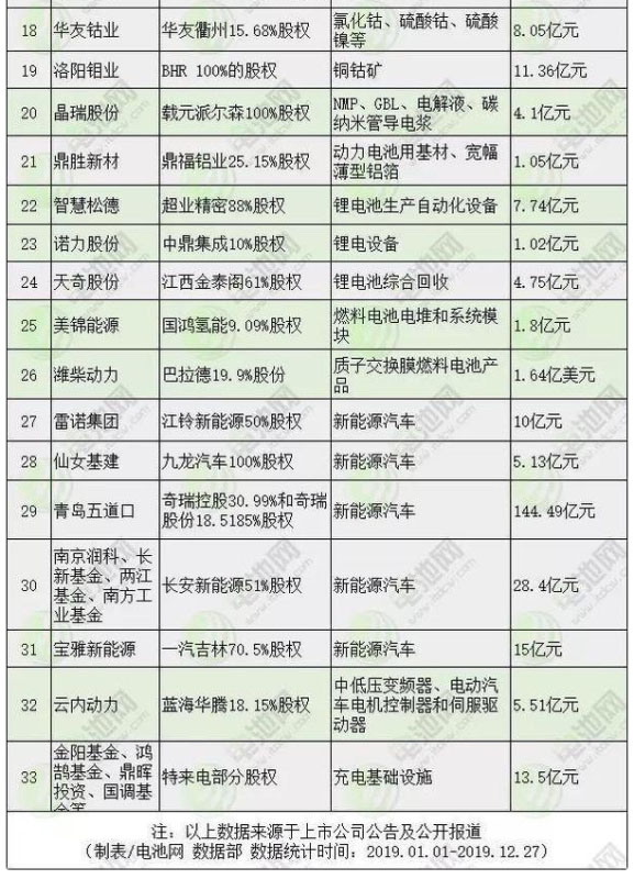 經(jīng)電池網(wǎng)不完全統(tǒng)計(jì),2019年在新能源電池領(lǐng)域,交易金額超1億元的收購(gòu)并購(gòu)事件有33個(gè),總金額約384.29億元,平均交易金額11.65億元。其中,被收購(gòu)并購(gòu)的企業(yè)中,鋰電池企業(yè)有5家,正極材料企業(yè)1家,負(fù)極材料企業(yè)2家,隔膜企業(yè)3家,礦產(chǎn)資源企業(yè)8家,電解液企業(yè)1家,鋁箔企業(yè)1家,設(shè)備企業(yè)2家,電池回收企業(yè)1家;燃料電池企業(yè)2家;新能源汽車企業(yè)5家,電控企業(yè)1家,充電基礎(chǔ)設(shè)施企業(yè)1家。