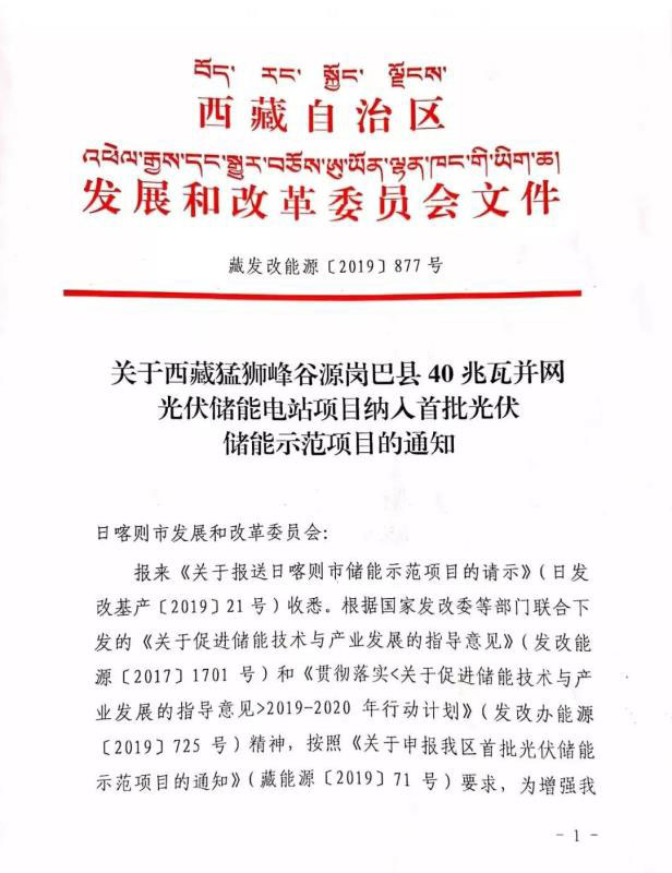 中國(guó)儲(chǔ)能網(wǎng)訊:12月26日,西藏自治區(qū)發(fā)展和改革委員會(huì)下發(fā)《關(guān)于西藏猛獅峰谷源崗巴縣40兆瓦并網(wǎng)光伏儲(chǔ)能電站項(xiàng)目納入首批光伏儲(chǔ)能示范項(xiàng)目的通知》(藏發(fā)改能源〔2019〕877號(hào)),批復(fù)同意西藏猛獅峰谷源崗巴縣40MW光伏+193MWh儲(chǔ)能項(xiàng)目納入西藏首批光儲(chǔ)示范項(xiàng)目。文件肯定了西藏猛獅峰谷源崗巴縣40兆瓦并網(wǎng)光伏儲(chǔ)能電站項(xiàng)目推廣高原高海拔地區(qū)儲(chǔ)能系統(tǒng)的積極示范作用。