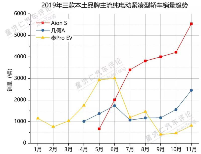 不難看出,官方統(tǒng)計(jì)口徑中,整體市場中個人購買新能源汽車的比例大約在50%-60%的水平。那么,如果再具體到家用消費(fèi)最主流的細(xì)分市場——緊湊型轎車市場,情況是否會有變化?今年前11個月,三款本土品牌主流純電動緊湊型轎車——廣汽新能源Aion S、吉利幾何A、比亞迪秦Pro EV的銷量走勢也許能說明問題。