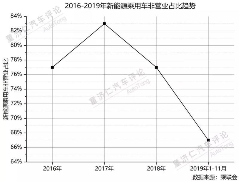 而在乘聯(lián)會的數(shù)據(jù)中,今年1-11月純電動乘用車非營業(yè)的比例為67%,是近四年來的最低值,意味著出租租賃等單位新能源乘用車采購占比在逐步提升。