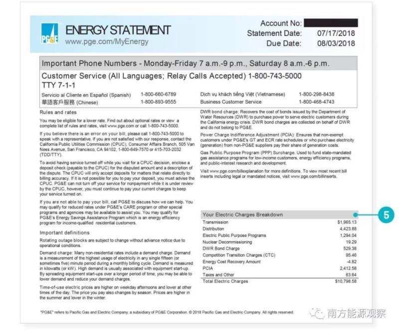 這份賬單包含了以下幾個部分:首先是按照套餐計劃付給零售商的費用;其次是支付給PG&E的輸電配電費用(該費用受到加州公用事業(yè)委員會監(jiān)管,收費標準規(guī)定得很詳細,用戶可以隨時對這些文件進行查閱);其余的是核電退役、電力公共項目費、競爭性轉(zhuǎn)換費、公用供水公司債券費用、繳納稅制等其他費用。賬單對于電力輸送費用和套餐計劃也有十分詳細的解釋明細。