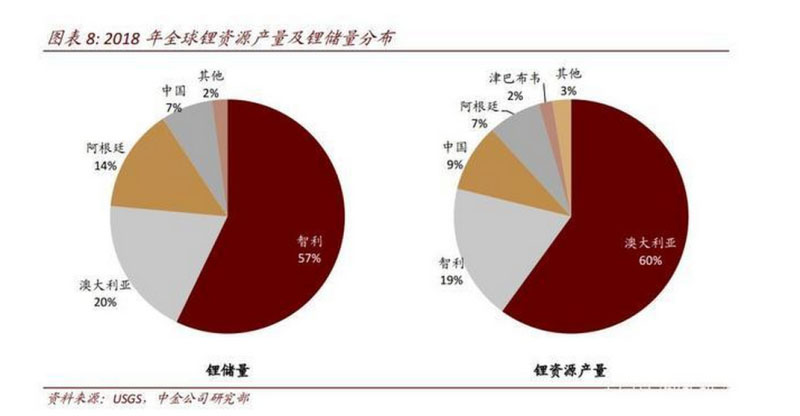 從上游看,鋰的來源主要在鹽湖和巖石礦,而巖石礦為花崗偉晶巖礦床,主要有鋰輝石和鋰云母兩大類。全球鹽湖多分布于智利、阿根廷等南美洲國家,巖石礦的鋰輝石礦則主要分布于澳大利亞、加拿大、津巴布韋、扎伊爾、巴西和中國,鋰云母礦主要分布于津巴布韋、加拿大、美國、墨西哥和中國。其中,巖石礦的鋰輝石是最富含鋰和有利于工業(yè)利用的原料,也是目前全球主要開發(fā)和工業(yè)應(yīng)用的固體鋰礦。
