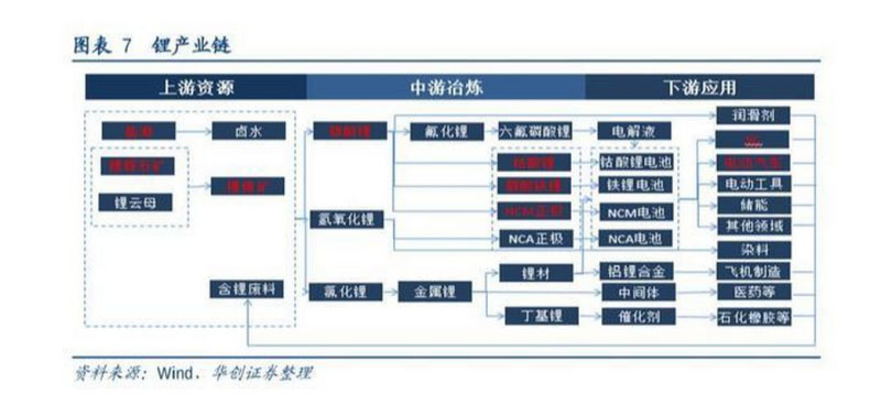 由于鋰具有完備的工業(yè)分級體系,因此形成了一條從上游鹽湖和礦石到中游鋰產(chǎn)品,再到下游涉及傳統(tǒng)工業(yè)、新材料以及新能源等各個領(lǐng)域的產(chǎn)業(yè)鏈。
