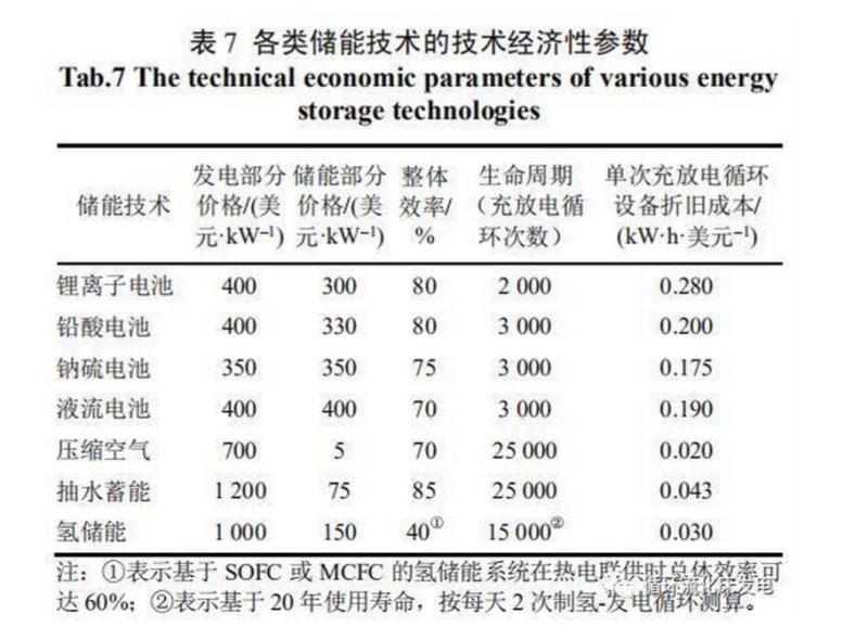 氫儲(chǔ)能相較于其他儲(chǔ)能方式的劣勢(shì)在于能源轉(zhuǎn)化效率低、成本高。美國(guó)Sandia國(guó)家實(shí)驗(yàn)室在2015年發(fā)布了關(guān)于儲(chǔ)能技術(shù)經(jīng)濟(jì)性分析的報(bào)告,總結(jié)了各種已商業(yè)化的儲(chǔ)能技術(shù)的價(jià)格、效率及使用壽命,見表7。目前常用電化學(xué)電池的效率為70%~80%,而氫儲(chǔ)能系統(tǒng)即便在考慮熱電聯(lián)供的條件下效率也僅有40%左右。