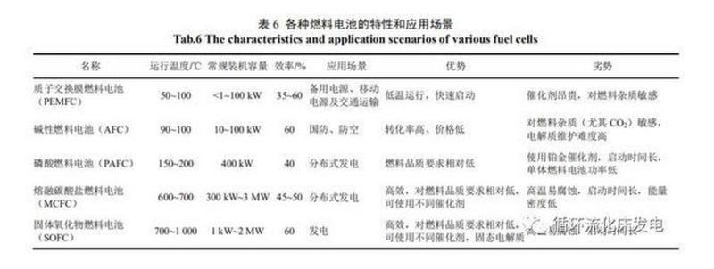 燃料電池能將氫的化學(xué)能直接轉(zhuǎn)化為電能,具有較高的能量轉(zhuǎn)換效率,因此燃料電池發(fā)電是未來氫能利用的主流技術(shù)。根據(jù)工作溫度和電解質(zhì)的不同,燃料電池分為中低溫條件下工作的質(zhì)子交換膜燃料電池(protonexchangemembranefuelcell,PEMFC)、堿性燃料電池(alkalinefuelcell,AFC)和磷酸燃料電池(phosphoricacidfuelcell,PAFC),此外還有在高溫工況下工作的熔融碳酸鹽燃料電池(moltencarbonatefuelcell,MCFC)和固體氧化物燃料電池(solidoxidefuelcell,SOFC)。據(jù)美國(guó)能源部發(fā)布的氫燃料電池技術(shù)比較,各種燃料電池的特性和應(yīng)用場(chǎng)景見表6。