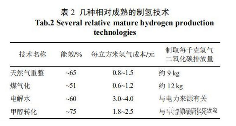 目前,主要以煤或天然氣等為原料來制取氫氣,來源于化石燃料的氫氣約占?xì)錃饪偖a(chǎn)量的95%。幾種相對(duì)成熟的制氫技術(shù)見表2。我國(guó)是世界上氫氣產(chǎn)量最大的國(guó)家之一,年產(chǎn)氫氣量約2000萬(wàn)t,占世界氫總產(chǎn)量的1/3,并以煤氣化制氫為主。在煤炭?jī)r(jià)格為500元/t的情況下,煤制氫的成本約0.7元/m3。但是,此類技術(shù)需要結(jié)合CO2捕集和封存技術(shù)才能解決碳排放問題,因此不能作為氫能的長(zhǎng)久來源。