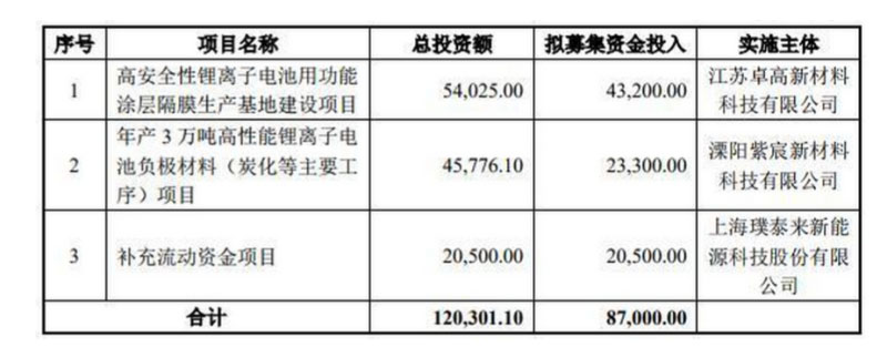 璞泰來擬向社會公開發(fā)行面值總額8.7億元可轉(zhuǎn)換公司債券,本次募集資金主要投向“高安全性鋰離子電池用功能涂層隔膜生產(chǎn)基地建設(shè)項目”、“年產(chǎn)3萬噸高性能鋰離子電池負極材料(炭化等主要工序)項目”及“補充流動資金項目”。