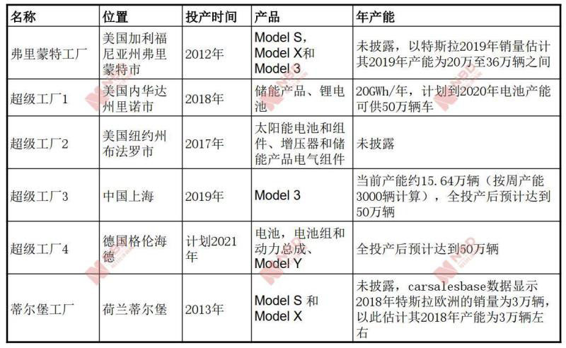 截至目前,特斯拉總計有6個工廠。2019年底位于中國上海的超級工廠3開始投產(chǎn),特斯拉披露其目前的周產(chǎn)能為3000輛,折算成年產(chǎn)能約為15.64萬輛。據(jù)《新京報》報道,其建成后的總產(chǎn)能會達到50萬輛。