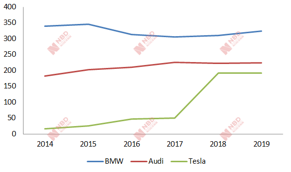 寶馬、奧迪和特斯拉在美國的汽車銷量(單位:千輛)
