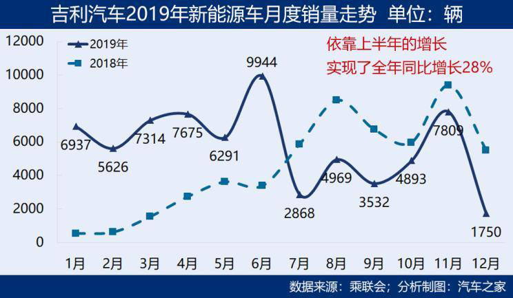 吉利汽車2019年累計(jì)銷售新能源乘用車6.96萬輛,同比增長28.1%,其中純電動(dòng)車型5.19萬輛,插電式混合動(dòng)力車型1.77萬輛。吉利汽車是四家頭部車企中唯一正增長的,當(dāng)然,新車上市是一個(gè)非常重要的原因。