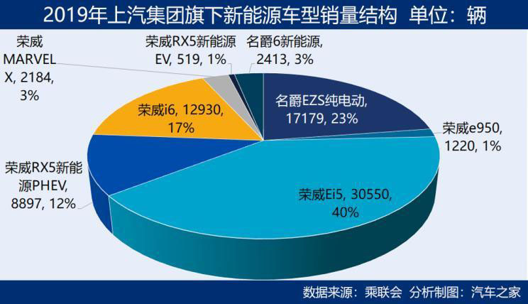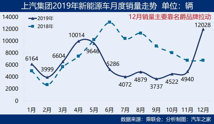 上汽集團(tuán)的新能源車型有榮威和名爵兩個(gè)板塊,榮威品牌是上汽集團(tuán)的新能源“老家底”,而名爵品牌去年開始推出純電動(dòng)車型和插電式混合動(dòng)力車型各一款。2019年上汽集團(tuán)銷量中純電動(dòng)車型5.04萬輛,插電式混合動(dòng)力車型2.55萬輛。12月份的銷量沖高,主要來自榮威Ei5的貢獻(xiàn)。即便如此,2019年全年上汽集團(tuán)旗下新能源車銷量還是同比下降了21.75%。