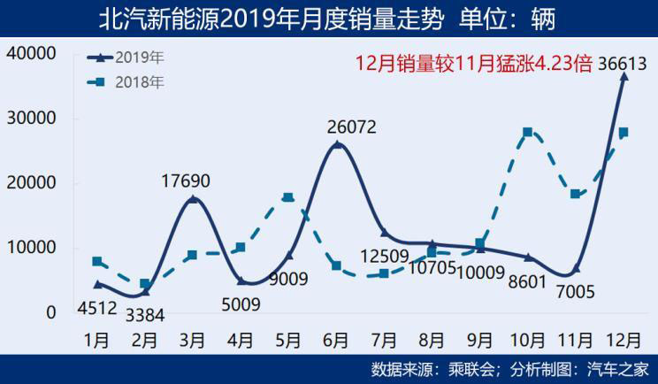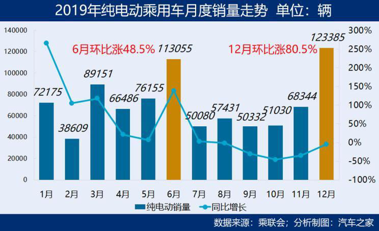 原本在盛夏既已“入冬”的新能源車市,卻于真正的隆冬中突現(xiàn) “陽春”,12月銷量止跌回升,環(huán)比大漲52.3%,收于13.83萬輛,并且成為2019年度銷量最高的月份。