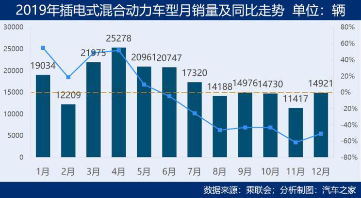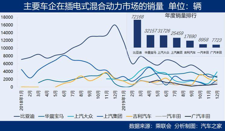 今年插電式混合動(dòng)力市場整體走弱,全年累計(jì)銷售20.8萬輛,其中12萬輛是在上半年完成的,下半年每個(gè)月的同比跌幅都在40%左右。與純電動(dòng)市場以中國車企為主不同,插電式混動(dòng)市場有更多的合資車企進(jìn)入。