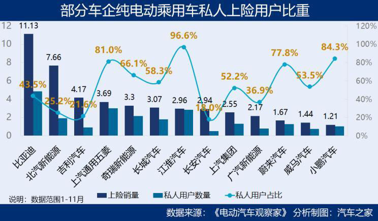 私人消費(fèi)比例到底有多少?交強(qiáng)險(xiǎn)數(shù)據(jù)能夠準(zhǔn)確地告訴我們新能源汽車賣到了誰手里。今年前十一個(gè)月的數(shù)據(jù)顯示,國內(nèi)純電動(dòng)汽車的消費(fèi)中,私人購買只占46%,而運(yùn)營車輛占到35%。在不到一半的私人消費(fèi)中,還有一定比例的是出行平臺注冊用戶,如果把這個(gè)再剔除出去,私人的購買比例還會(huì)進(jìn)一步降低。