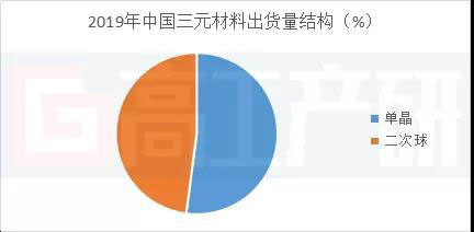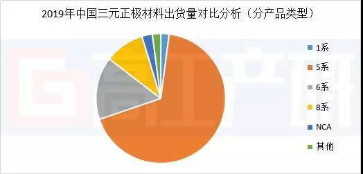 從三元正極產(chǎn)品型號(hào)來(lái)看,2019年三元材料出貨仍以5系(含數(shù)碼523、數(shù)碼55系、單晶523、單晶5515系、單晶5512系等)三元產(chǎn)品為主,占比65%;其次為6系產(chǎn)品,占比接近20%,其余為811、NCA、111等。