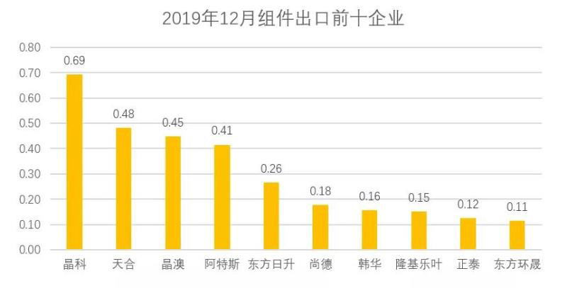 2019年12月,晶科重回組件出口冠軍,前十企業(yè)共計(jì)出口3.02GW,與11月基本持平,占總出口規(guī)模的68.5%。