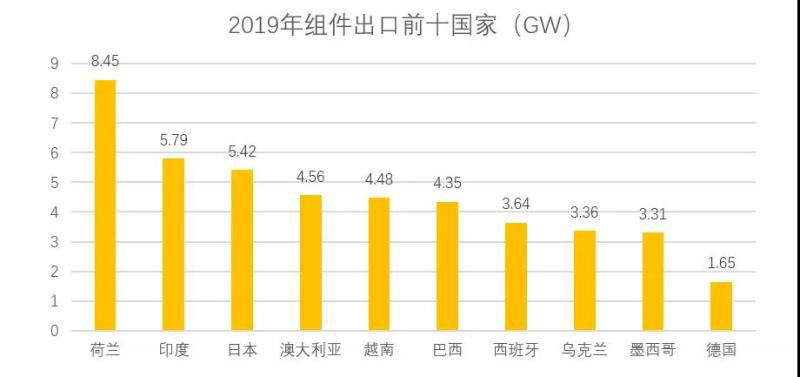 整體來看,2019年組件出口前十國家共計(jì)出口組件45.01GW,占總出口量的69%。