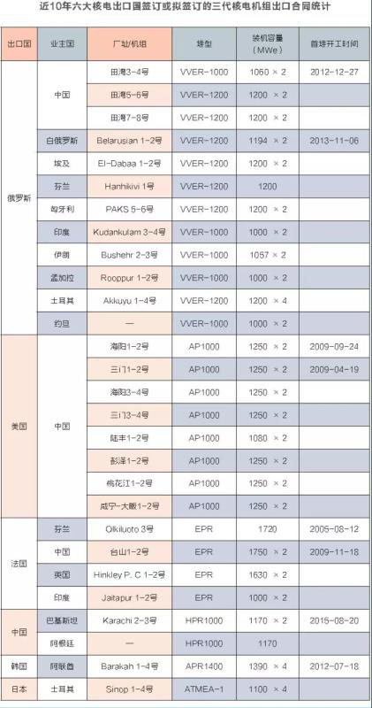 目前,世界上僅有俄羅斯、美國、法國、中國、韓國、日本六個國家具備出口三代輕水堆核電機組實力,六個國家的三代核電出口競爭力又各具特點。近10年,六大核電出口國利用各自三代核電的優(yōu)勢簽訂或擬簽訂的三代核電機組出口合同如下表所示。