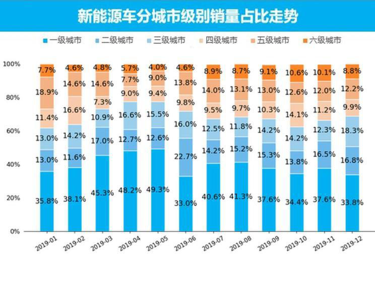 12月新能源車(chē)銷(xiāo)量最高的城市級(jí)別為一級(jí)城市,銷(xiāo)量為2.9萬(wàn)輛,銷(xiāo)量占比為33.8%,比上個(gè)月下跌了3.8個(gè)百分點(diǎn);與2018年同期相比,一級(jí)城市上漲1.8個(gè)百分點(diǎn),高線級(jí)城市配套設(shè)施完善,直接影響到新能源車(chē)的銷(xiāo)量走勢(shì)。銷(xiāo)量最低的城市級(jí)別為六級(jí)城市,銷(xiāo)量?jī)H為0.7萬(wàn)輛,銷(xiāo)量占比為8.8%,比上個(gè)月下跌了1.3個(gè)百分點(diǎn);與2018年同期相比,六級(jí)城市上漲1.2個(gè)百分點(diǎn),隨著新戶(hù)籍政策的放開(kāi)及高線級(jí)城市購(gòu)車(chē)限號(hào)的影響,低線級(jí)會(huì)帶來(lái)新的一輪新能源銷(xiāo)量熱潮。