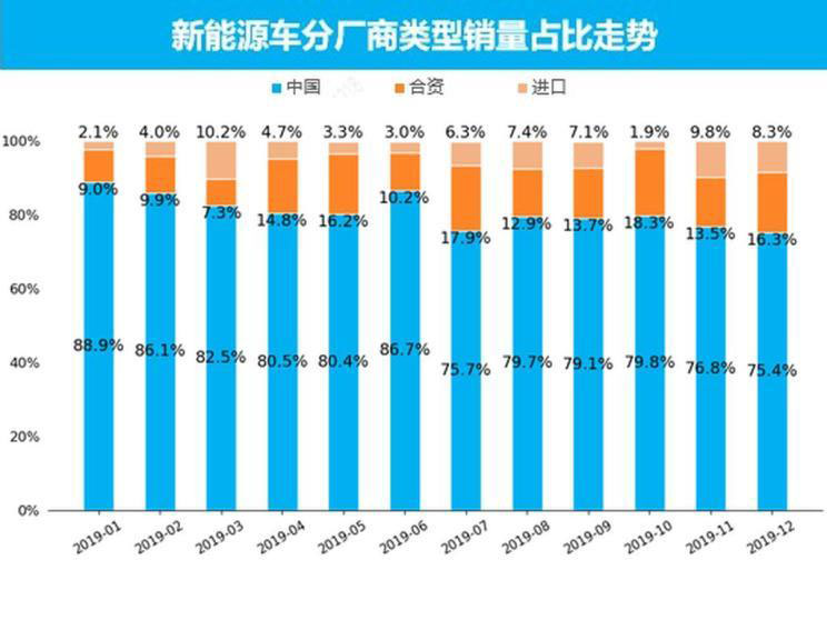 從廠商類(lèi)型銷(xiāo)量來(lái)看,12月新能源中國(guó)品牌銷(xiāo)量為6.4萬(wàn)輛,銷(xiāo)量占比為75.4%,比上個(gè)月下滑1.4個(gè)百分點(diǎn);與2018年同期相比,中國(guó)品牌下跌22.2個(gè)百分點(diǎn)。進(jìn)口品牌新能源銷(xiāo)量為0.7萬(wàn)輛,銷(xiāo)量占比為8.3%,比上個(gè)月下滑1.5個(gè)百分點(diǎn);與2018年同期相比,進(jìn)口品牌上漲6.6個(gè)百分點(diǎn)。合資品牌新能源銷(xiāo)量為1.4萬(wàn)輛,銷(xiāo)量占比為16.3%,比上個(gè)月增長(zhǎng)2.8個(gè)百分點(diǎn);與2018年同期相比,合資品牌增長(zhǎng)2.8個(gè)百分點(diǎn),隨著各大合資廠商均推出了各自的插電式混合動(dòng)力車(chē)型,用戶(hù)將會(huì)有更多的購(gòu)車(chē)選擇,未來(lái)合資品牌新能源將會(huì)迎來(lái)新一輪的上升走勢(shì)。整體來(lái)看,合資企業(yè)在新能源領(lǐng)域的加速布局及外資品牌的進(jìn)入,新能源領(lǐng)域的市場(chǎng)競(jìng)爭(zhēng)將會(huì)加劇,產(chǎn)業(yè)鏈整合也會(huì)加速。