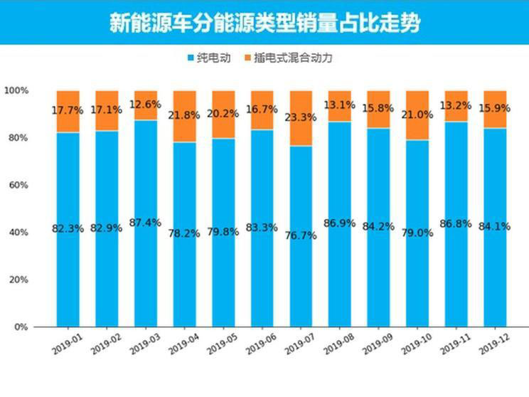 從能源類(lèi)型角度來(lái)看,12月純電動(dòng)車(chē)型銷(xiāo)量為7.1萬(wàn)輛,同比下跌67.6%,銷(xiāo)量占比為84.1%,純電動(dòng)車(chē)型仍占據(jù)著新能源車(chē)的主要市場(chǎng)份額;插電式混合動(dòng)力車(chē)型銷(xiāo)量為1.4萬(wàn)輛,同比上漲3.3%,銷(xiāo)量占比為15.9%。從近12個(gè)月的市場(chǎng)銷(xiāo)量占比情況來(lái)看,插電式混動(dòng)與純電動(dòng)車(chē)型基本上是“二八開(kāi)”的局面。