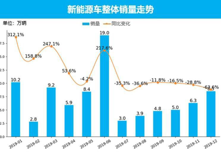 從新能源市場(chǎng)單月銷(xiāo)量情況來(lái)看,2019年12月共銷(xiāo)售了8.5萬(wàn)輛,占整個(gè)市場(chǎng)銷(xiāo)量的3.5%。原本是沖量最高峰的12月,環(huán)比增幅僅有35.7%,遠(yuǎn)不如2018年底環(huán)比164.8%的增幅,同比也下跌了63.6%。在整體市場(chǎng)持續(xù)低迷和經(jīng)濟(jì)低速增長(zhǎng)的大環(huán)境下,新能源車(chē)增長(zhǎng)動(dòng)力不足,銷(xiāo)量增速日益收窄。