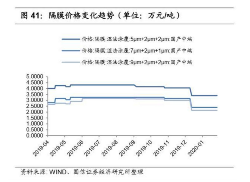目前國(guó)內(nèi)隔膜行業(yè)已進(jìn)入淡季,出貨普遍不高。隔膜市場(chǎng)混亂,價(jià)格戰(zhàn)現(xiàn)象較 為嚴(yán)重,待行業(yè)整合結(jié)束,預(yù)計(jì)明年隔膜價(jià)格可能會(huì)回歸理性。本周隔膜價(jià)格 穩(wěn)定,其中 5μm 濕法基膜報(bào)價(jià) 2.5-3.3 元/平方米;5μm+2μm+2μm 濕法涂覆隔 膜報(bào)價(jià)為 3-3.8 元/平方米;7um 濕法基膜報(bào)價(jià)為 1.8-2.2 元/平方米; 7μm+2μm+2μm 濕法涂覆隔膜報(bào)價(jià)為 2.2-2.6 元/平方米。動(dòng)力價(jià)格方面:14μm 干法基膜報(bào)價(jià)為 1-1.1 元/平方米;9um 濕法基膜報(bào)價(jià) 1.3-1.7 元/平方米; 9μm+2μm+2μm 濕法涂覆隔膜報(bào)價(jià)為 1.8-2.5 元/平方米。