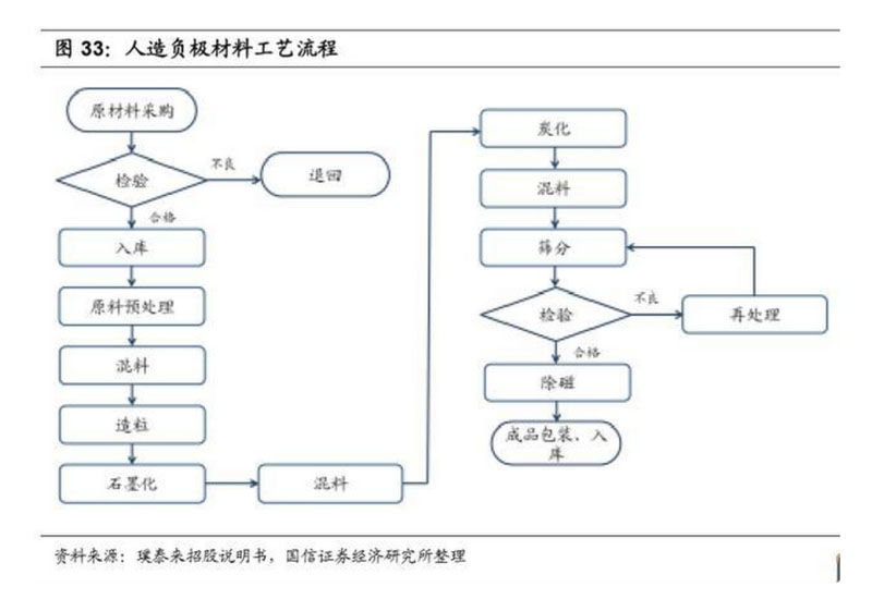 人造石墨負(fù)極技術(shù)路線相對(duì)比較成熟,更多壁壘集中在造粒工藝上。人造石墨 的理論比容量為 372mah/g,目前主流產(chǎn)品能做到 345-355mah/g,其生產(chǎn)工藝 是將骨料和粘接劑進(jìn)行破碎、造粒、石墨化、篩分而成,相對(duì)于天然石墨負(fù)極 的粉碎-球形化-混合-過篩-磁選過程,人造石墨負(fù)極多了造粒-石墨化和二次造粒 三個(gè)關(guān)鍵過程,各家基本工序流程是一致的,但又會(huì)有一定的差異,如炭化環(huán) 節(jié)和改性環(huán)節(jié)、篩分次數(shù)等。