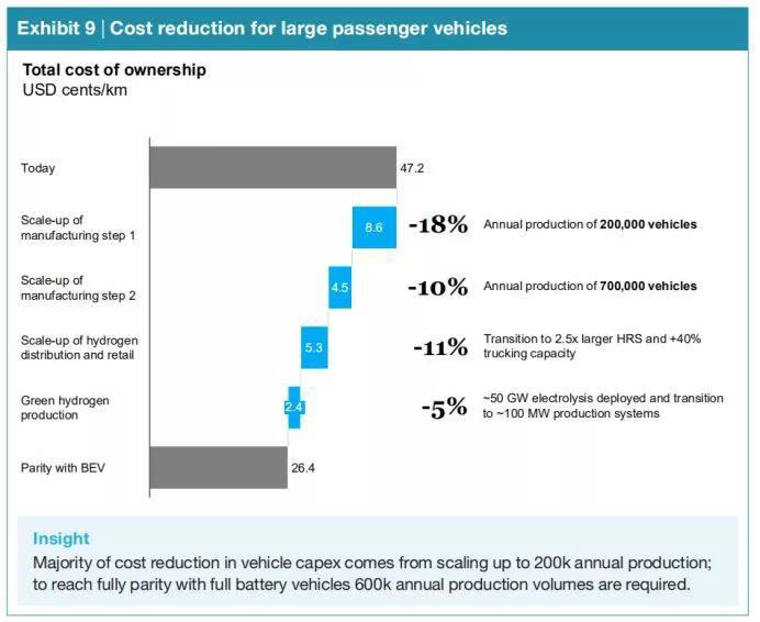 到2030年,大型乘用車的TCO可能下降約45%,這主要受三個主要因素的影響:低成本的汽車資本支出,低成本的氫氣分銷和零售以及低成本的氫氣生產。這些成本降低對于實現與BEV的成本均等至關重要。