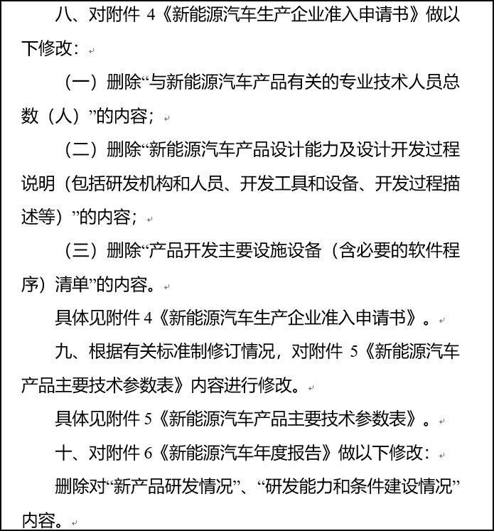 三、其他修改內(nèi)容以刪減為主,如原第二十九條、第三十條、第三十一條內(nèi)容被刪除,如附件4《新能源汽車生產(chǎn)企業(yè)準(zhǔn)入申請書》中,刪除了“與新能源汽車產(chǎn)品有關(guān)的專業(yè)技術(shù)人員總數(shù)(人)”、“新能源汽車產(chǎn)品設(shè)計(jì)能力及設(shè)計(jì)開發(fā)過程說明(包括研發(fā)機(jī)構(gòu)和人員、開發(fā)工具和設(shè)備、開發(fā)過程描述等)”、“產(chǎn)品開發(fā)主要設(shè)施設(shè)備(含必要的軟件程序)清單”等內(nèi)容。