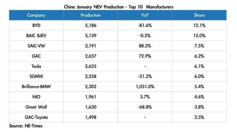 中國(guó)儲(chǔ)能網(wǎng)訊:北京時(shí)間2月13日上午消息,據(jù)外媒報(bào)道,1月份對(duì)特斯拉的上海超級(jí)工廠而言,十分重要。中國(guó)制造的Model 3的生產(chǎn)終于在2019年試生產(chǎn)之后變得熱火朝天。報(bào)道顯示,即便因?yàn)檗r(nóng)歷新年工廠放假休息、隨后又遇上冠狀病毒爆發(fā),上海超級(jí)工廠在1月份仍可以生產(chǎn)制造2600多輛中國(guó)制造的Model 3。這樣的產(chǎn)能,讓特斯拉在2020年1月份在中國(guó)生產(chǎn)的電動(dòng)汽車數(shù)量居該國(guó)第五位。