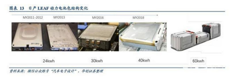 從電池包結(jié)構(gòu)角度看,LEAF也在通過電芯容量提升,及電池Pack結(jié)構(gòu)設(shè)計的迭代,來實現(xiàn)電池包容量,和成組效率提升。