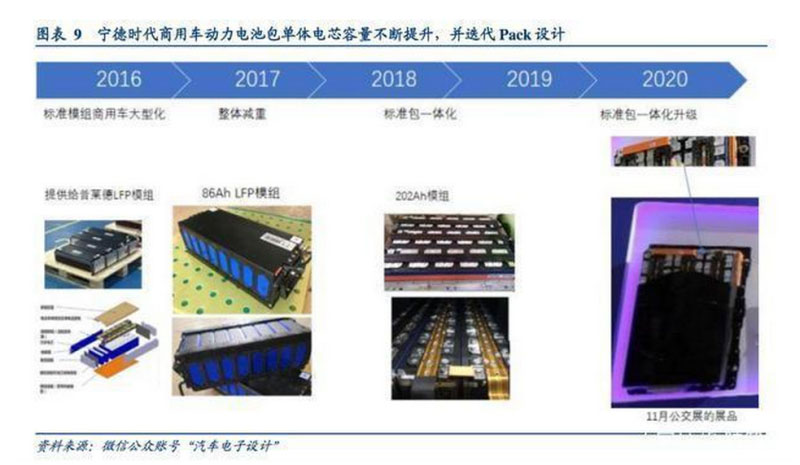 以寧德時代為代表的動力電池生產(chǎn)商,自2013年國內(nèi)新能源商用車逐漸形成市場規(guī)模之后,也在通過電芯(提升單體電芯容量)和模組結(jié)構(gòu)迭代(如combo模組集成技術(shù))和電池包結(jié)構(gòu)設(shè)計,來推動鐵鋰電池包能量密度提升,和制造成本的降低。