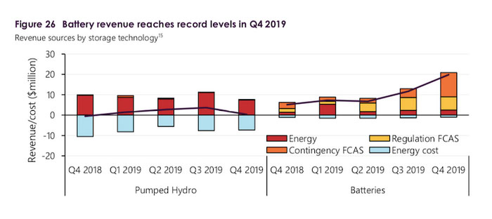根據(jù)澳大利亞能源市場運營商(AEMO)的調(diào)查,僅在2019年第四季度,澳大利亞正在運營的五個電池儲能系統(tǒng)(其中包括 Hornsdale、Dalrymple North、Ballarat、Gannawarra和新建成的Bonney Lake)就獲得了2,000萬美元收入,與2018年第四季度相比增加了70%。
