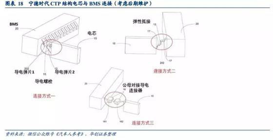 根據(jù)行業(yè)媒體披露的電池專利圖可以看到,寧德時(shí)代CTP結(jié)構(gòu)電池包中,電芯和電池管理系統(tǒng)連接結(jié)構(gòu),以及電芯與電池包殼體結(jié)構(gòu)(壓力和溫度傳感器放置)出現(xiàn)變化。此設(shè)計(jì)易于電池散熱處理,不采購(gòu)模組結(jié)構(gòu)降低裝配難度提高生產(chǎn)效率,同時(shí)也便于電芯維護(hù)管理。