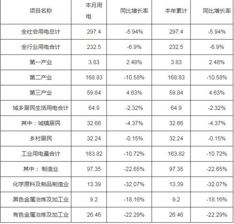 (一)全社會(huì)用電量情況。全省全社會(huì)用電量297.4億千瓦時(shí),同比減少5.94%;累計(jì)用電量297.4億千瓦時(shí),同比減少5.94%。
