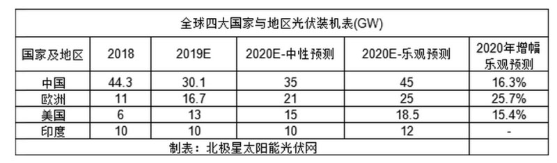 2019年全球新增光伏裝機量約123GW,較去年增長11.2%;2020年全球新增光伏裝機量約140GW,預(yù)計增長13.8%。在全球裝機數(shù)量超過10GW的四大裝機市場中,中國新裝機量將增長5GW ,歐洲新裝機量將增長4.3GW ,美國新光伏裝機增長3.5GW,印度將維持原地踏步。