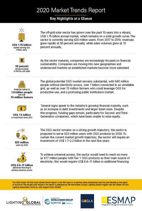 NAIROBI, Feb. 18, 2020 – The off-grid solar industry has grown into a $1.75 billion annual market, providing lighting and other energy services to 420 million users and remains on a solid growth curve, a new World Bank Group and GOGLA report shows.