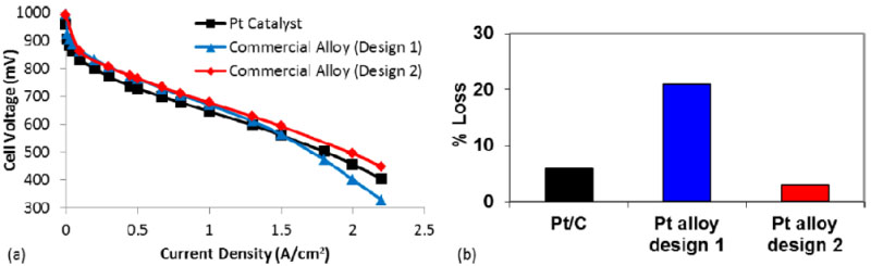 a)兩種催化層設(shè)計(jì)下商用Pt/C和Pt合金催化劑的極化曲線;b)每種催化層設(shè)計(jì)在5000次0.6-1.0 V電壓循環(huán)后的性能損失
