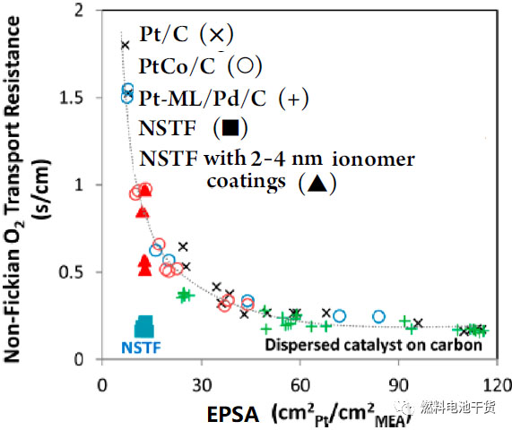盡管目前電化學(xué)活性面積這一參數(shù)尚未在美國(guó)能源部的燃料電池電催化劑技術(shù)目標(biāo)里出現(xiàn),但顯然如果要實(shí)現(xiàn)<0.1 mg PGM/cm2的陰極催化劑擔(dān)載量目標(biāo),電化學(xué)活性面積也是一個(gè)關(guān)鍵參數(shù)。具體來說,目前已廣泛報(bào)道,當(dāng)EPSA(實(shí)際鉑表面積/MEA幾何表面積)達(dá)到<?50 cm2 Pt/cm2 MEA時(shí),電流密度>1.5 A/cm2下觀察到的性能損失超過傳統(tǒng)的巴特勒-沃爾默動(dòng)力學(xué)所預(yù)測(cè)的損失,這種額外的性能損失是氧氣通過覆蓋催化劑表面的聚合物膜時(shí)傳輸阻力引起的。隨著EPSA降低,每個(gè)催化劑顆粒上的局部氧氣通量會(huì)大大增加,導(dǎo)致傳輸阻力的局部升高。