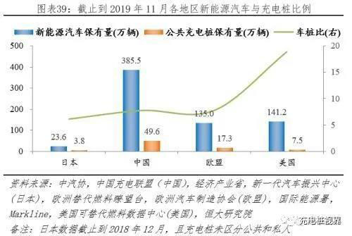 截止到2019年11月,據(jù)中汽協(xié)、中國充電聯(lián)盟統(tǒng)計(jì),中國新能源汽車、公共充電樁保有量分別為385.5萬輛、49.6萬個(gè),對(duì)應(yīng)車樁比7.77:1;據(jù)ACEA、歐盟替代燃料瞭望臺(tái)統(tǒng)計(jì),歐盟新能源汽車、公共充電樁保有量分別為135.0萬輛、17.3萬個(gè),對(duì)應(yīng)車樁比7.78:1;據(jù)Markline、美國可替代燃料數(shù)據(jù)中心統(tǒng)計(jì),美國新能源汽車、公共充電樁保有量分別為141.2萬輛、7.5萬個(gè),對(duì)應(yīng)車樁比18.88:1。截止到2018年12月,據(jù)日本經(jīng)濟(jì)產(chǎn)業(yè)省披露,日本新能源汽車保有量23.6萬輛;據(jù)新一代汽車振興中心披露,充電樁保有量3.8萬個(gè),對(duì)應(yīng)車樁比6.15:1。