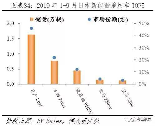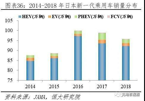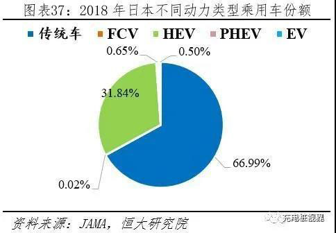 日本新一代汽車HEV占據(jù)統(tǒng)治地位。日本由于發(fā)動(dòng)機(jī)技術(shù)領(lǐng)先,發(fā)展HEV有天然優(yōu)勢(shì),故將HEV納入新一代汽車體系,與EV和PHEV共同發(fā)展。據(jù)日本汽車銷售聯(lián)合會(huì)(JAMA)披露,2018年日本乘用車新車HEV、EV、PHEV、FCV、傳統(tǒng)車銷量分別為92.18、1.46、1.88、0.06、193.97萬輛,分別占比66.99%、31.84%、0.65%、0.50%、0.02%。