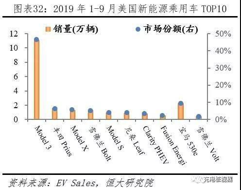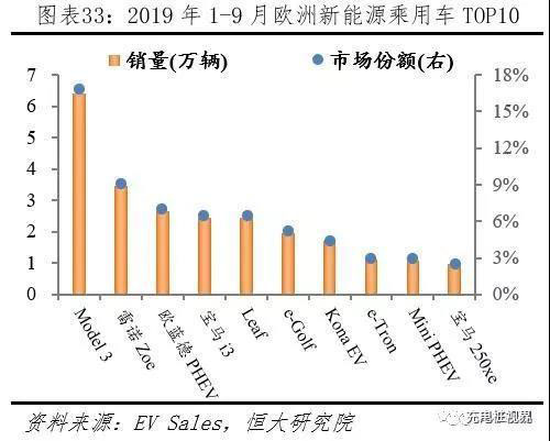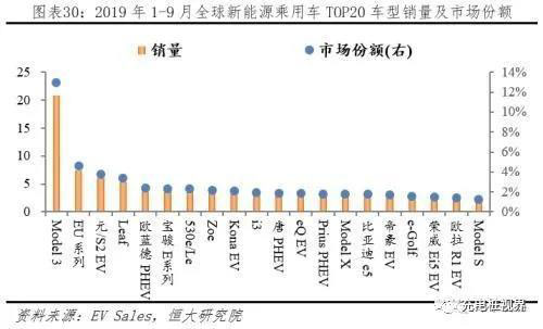 TOP20車型中國占有9席、歐盟占據(jù)5席、特斯拉全系上榜、Model 3一枝獨(dú)秀。據(jù)EV Sales統(tǒng)計(jì),2019年1-9月全球新能源乘用車TOP20車型銷量從高到低依次為:Model 3、EU系列、元/S2 EV、Leaf、歐藍(lán)德 PHEV、寶駿 E系列、530e/Le、Zoe、Kona EV、寶馬i3、唐 PHEV、eQ EV、PriusPHEV、Model X、比亞迪e5、帝豪 EV、e-Golf、榮威 Ei5 EV、歐拉 R1 EV、Model S;對(duì)應(yīng)銷量20.80、7.43、6.08、5.38、3.86、3.73、3.68、3.52、3.30、3.06、3.00、2.96、2.87、2.86、2.84、2.73、2.54、2.35、2.26、2.05萬輛;其中中國9款,美國3款,日本2款,歐盟5款,韓國1款。