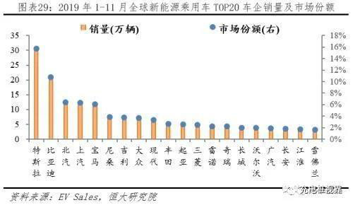 特斯拉、比亞迪市占率均超過10%,北汽、上汽、寶馬市占率均超過5%。據(jù)EV Sales披露,2019年1-11月全球新能源乘用車TOP20車企銷量從高到低依次為:特斯拉、比亞迪、北汽、上汽、寶馬、尼桑、吉利、大眾、現(xiàn)代、豐田、起亞、三菱、雷諾、奇瑞、長城、沃爾沃、廣汽、長安、江淮和雪佛蘭,其中中國10家、美國2家、日本3家、歐盟3家、韓國2家;TOP20對(duì)應(yīng)銷量為中國75.51萬、美國33.65萬、日本17.50萬、歐盟23.26萬、韓國11.65萬輛;TOP20對(duì)應(yīng)市占率為中國38.88%、美國17.32%、日本9.01%、歐盟11.97%、韓國5.96%。
