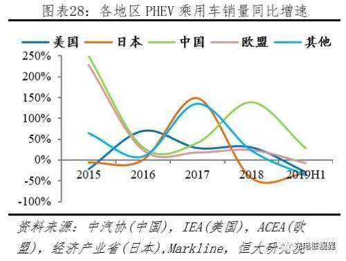 2019H1全球市場(chǎng)PHEV增速下滑,歐美EV、PHEV增速分化嚴(yán)重。2019H1新能源乘用車市場(chǎng),據(jù)中汽協(xié)披露,中國EV、PHEV同比增速分別為69.9%、28.0%;據(jù)ACEA披露,歐盟EV、PHEV同比增速90.9%、-6.9%;據(jù)Markline披露,日本EV、PHEV同比增速-27.7%、-31.1%,美國EV、PHEV同比增速68.0%、-29.5%,其它地區(qū)EV、PHEV同比增速52.7%、-37.6%。按照上述統(tǒng)計(jì),2019H1全球新能源乘用車市場(chǎng),EV、PHEV同比增速分別為68.7%、-0.8%。