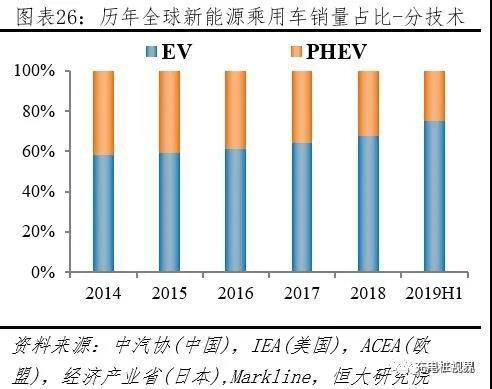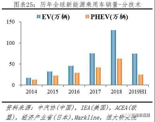 2019H1全球新能源乘用車市場(chǎng)EV占比3/4,份額持續(xù)提升。2019H1新能源乘用車市場(chǎng),據(jù)中汽協(xié)披露,中國EV、PHEV分別銷售44.0、12.3萬輛;據(jù)ACEA披露,歐盟EV、PHEV分別銷售12.5、7.2萬輛;據(jù)Markline披露,美國EV、PHEV分別銷售10.6、3.1萬輛,日本EV、PHEV分別銷售1.1、0.7萬輛,其它地區(qū)EV、PHEV分別銷售6.2、1.2萬輛。按上述統(tǒng)計(jì),2019H1全球新能源乘用車市場(chǎng),EV、PHEV分別銷售74.4、24.6萬輛;EV市場(chǎng)份額從2014年58.4%提升到2019上半年75.2%。