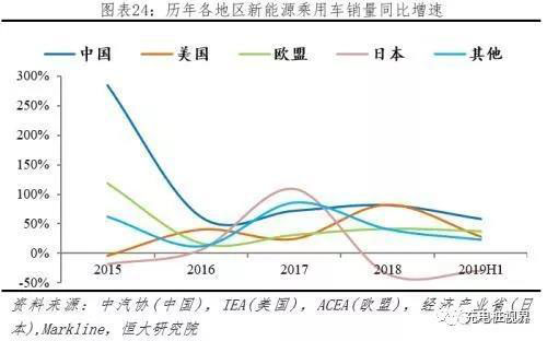 歐盟增速持穩(wěn),中、美增速下滑,日本持續(xù)負(fù)增長。據(jù)中汽協(xié)、IEA、ACEA等機(jī)構(gòu)統(tǒng)計(jì),2018年中國、美國、歐盟、日本、其它地區(qū)同比增速分別為81.9%、82.2%、42.2%、-34.4%、40.6%;2019H1中國、美國、歐盟、日本、其它地區(qū)同比增速分別為58.6%、27.9%、37.9%、-29.1%、23.1%。