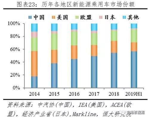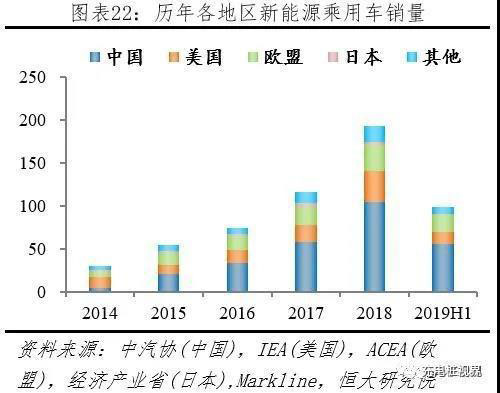 2019H1新能源乘用車全球份額,中國五成、歐盟兩成、美日共兩成。據(jù)中汽協(xié)披露,2018、2019H1中國新能源乘用車分別銷售105.3、56.3萬輛;據(jù)IEA、Markline披露,2018、2019H1美國新能源乘用車分別銷售36.1、13.7萬輛;據(jù)ACEA披露,2018、2019H1歐盟新能源乘用車分別銷售30.2、19.8萬輛;據(jù)經(jīng)濟(jì)產(chǎn)業(yè)省、Markline披露,2018、2019H1日本新能源乘用車分別銷售18.4、7.4萬輛;據(jù)IEA、Markline披露,2018、2019H1其它地區(qū)新能源乘用車分別銷售18.4、7.4萬輛。按照上述統(tǒng)計(jì), 2019H1中國、美國、歐盟、日本、其它地區(qū)新能源乘用車市場(chǎng)份額分別為56.9%、13.8%、20.0%、1.8%、7.5%。
